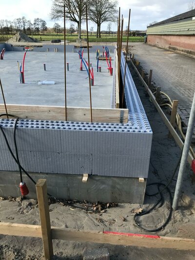 Uiteindelijk bouwde hij, na overleg met de architect, een betonnen zwembad-constructie. De vloer is een betonnen plaatfundering en de muren zijn opgebouwd door grote legoblokken. Deze blokken hebben een kern van veertien centimeter. Daar is beton ingestort. Zowel de binnen- als de buitenkant is geïsoleerd. “Zo heb je een dichte bak”, legt Marc uit. “De kozijnen zijn er zo ingezet dat ze in principe waterdicht zijn. Helemaal waterdicht maken is haast onmogelijk. Als er echt hoogwater dreigt, kan ik er altijd nog aluminiumschotten met een klemfunctie voor spannen.”